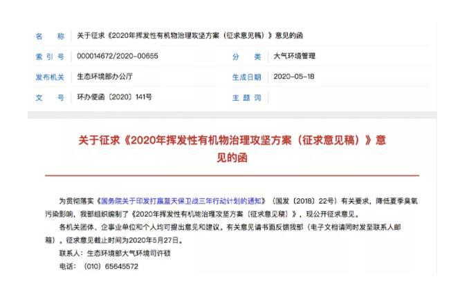 近日,生態(tài)環(huán)境部發(fā)布了關于征求《2020年揮發(fā)性有機物治理攻堅方案(征求意見稿)》意見的函,稱為貫徹落實《國務院關于印發(fā)打贏藍天保衛(wèi)戰(zhàn)三年行動計劃的通知》(國發(fā)〔2018〕22號)有關要求,降低夏季臭氧污染影響,生態(tài)環(huán)境部組織編制了《2020年揮發(fā)性有機物治理攻堅方案(征求意見稿)》,現(xiàn)公開征求意見。征求意見截止時間為2020年5月27日。