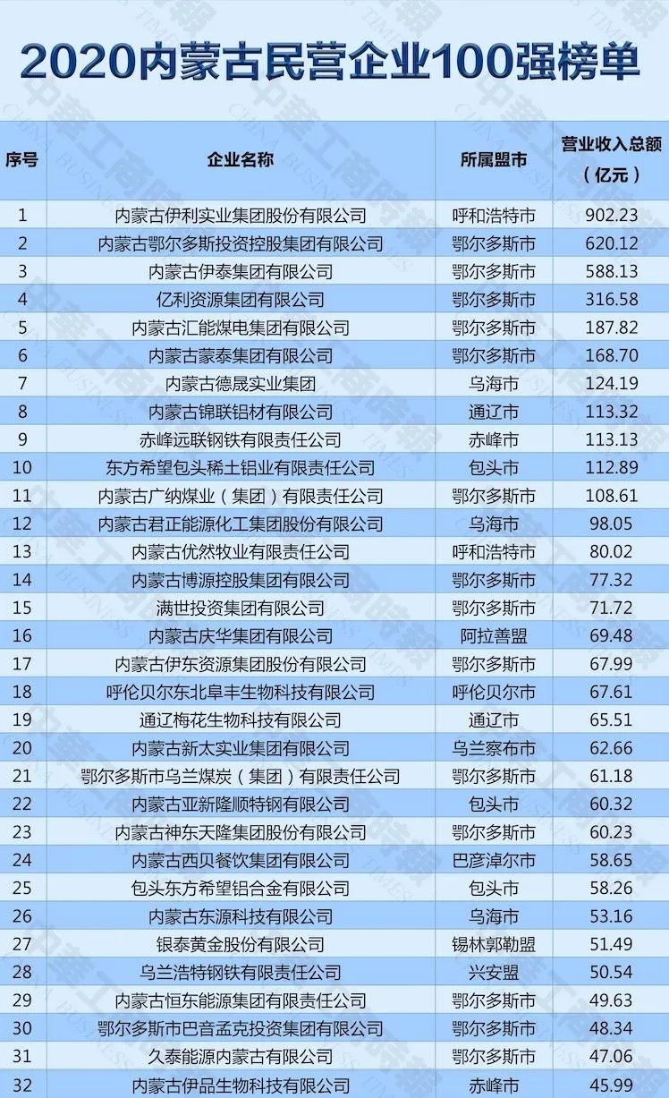 一年一度的內(nèi)蒙古民營(yíng)經(jīng)濟(jì)盛會(huì)隆重召開(kāi)。12月12日,2020內(nèi)蒙古民營(yíng)企業(yè)100強(qiáng)發(fā)布會(huì)暨民營(yíng)經(jīng)濟(jì)創(chuàng)新發(fā)展大講堂在內(nèi)蒙古自治區(qū)呼和浩特市舉行。內(nèi)蒙古伊利實(shí)業(yè)集團(tuán)以902.23億元的營(yíng)業(yè)收入總額穩(wěn)居榜首,鄂爾多斯投資控股集團(tuán)(鄂絨集團(tuán))以620.12億元排行第二,內(nèi)蒙古伊泰集團(tuán)有限公司以588.13億元位居第三。